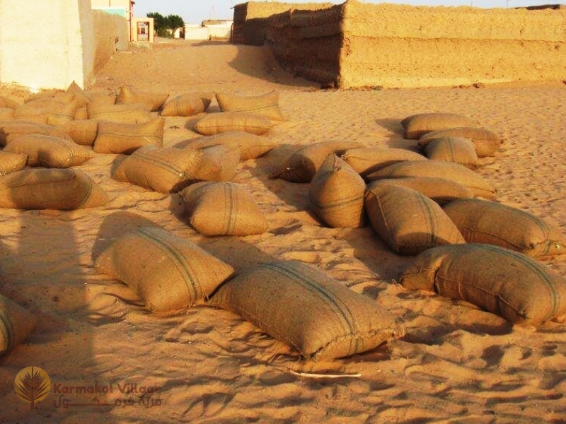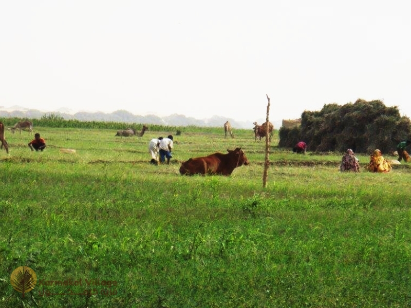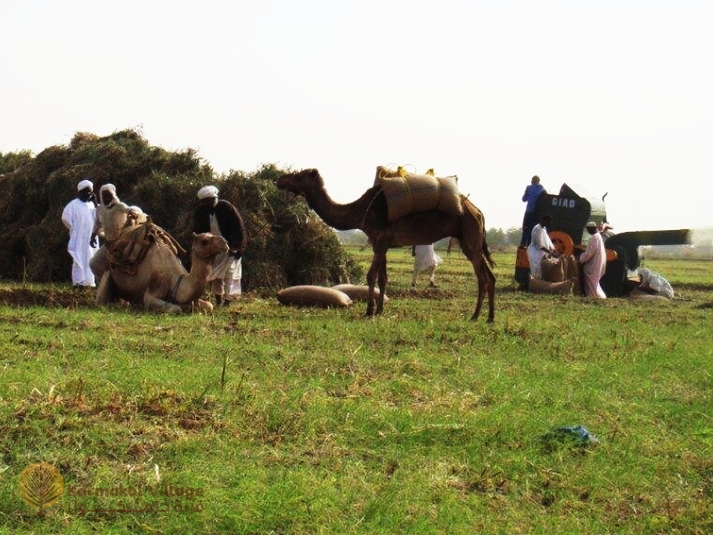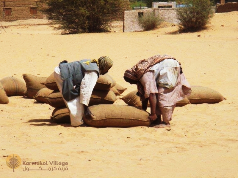 ينقسم حصاد الفول إلي مرحلتين ، مرحلة القطع (حش الفول) ، ثم يربط في حزم بعد ان يجف (رأس) ومن ثم يجمع في مكان واحد يتم اعداده جيدا يسمي التقاه ، لتبدأ عملية النوريق وهي عملية طحن سيقان الفول بواسطة الحمير ، وهى ربط عدد من الحمير في صف واحد لتلف في شكل دائرة الي ان يتم طحن الفول ..بعدها تأتي مرحلة التضراه وهذه تتم بواسطة نساء خبيرات في هذه العملية مع الاستعانة بالرياح وذلك لفصل الفول عن المخلفات ( التبن) ، وبعدها يعبأ المحصول في شوالات ثم يرحل للمخازن ..
